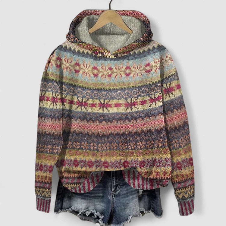 Exprimați-vă stilul unic și adăugați un plus de personalitate garderobei dumneavoastră cu acest hanorac retro cu imprimeu etnic. Ideal pentru femeile care caută combinația perfectă între modă, confort și originalitate.