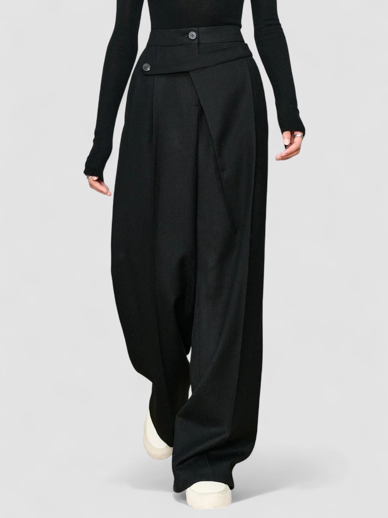 Design: Pantaloni eleganți cu picior drept, având o talie asimetrică stratificată cu detalii cu nasturi, adăugând o notă modernă unei siluete clasice. Designul croit îmbunătățește un aspect elegant și sofisticat.