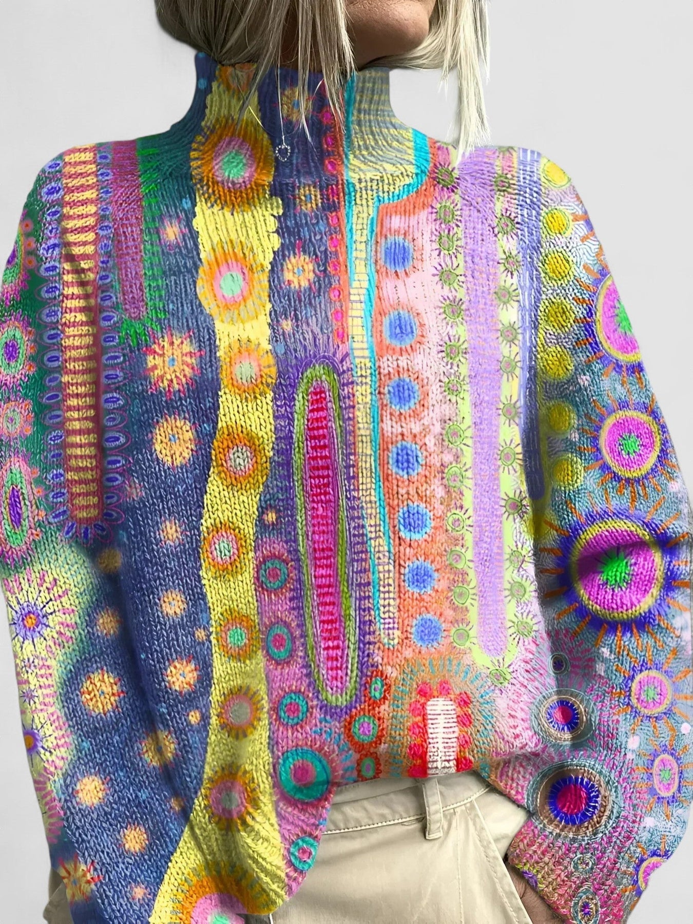 Înfășură-te în căldură cu acest pulover tricotat cu guler înalt, care prezintă un model abstract colorat. Ideal pentru culoare și confort în timpul iernii.