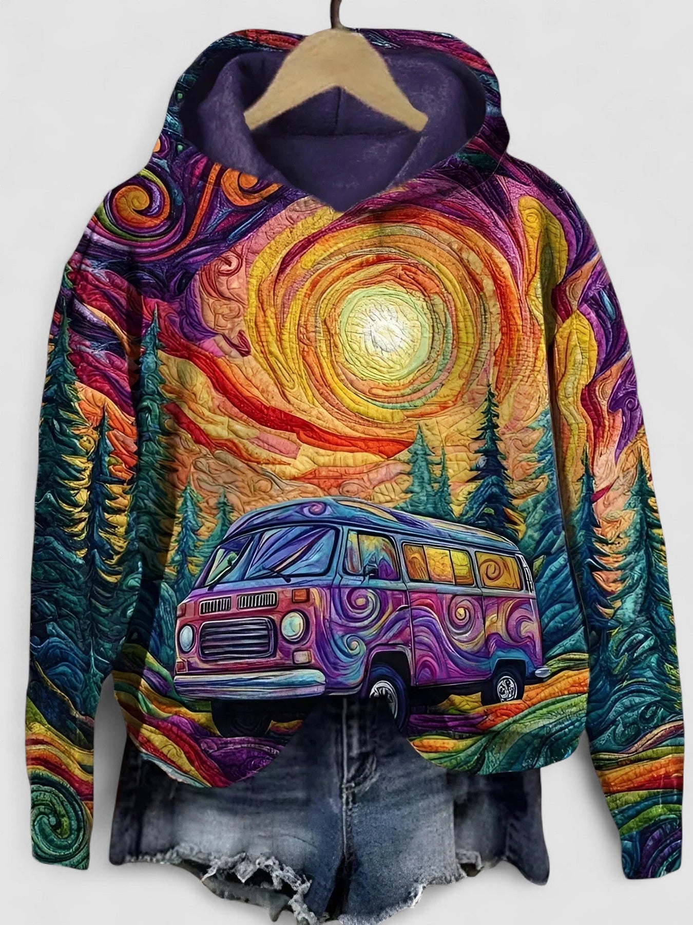 Designul vibrant, care prezintă un autobuz retro colorat și un fundal stelar, aduce un sentiment de aventură și magie oricărei ținute.