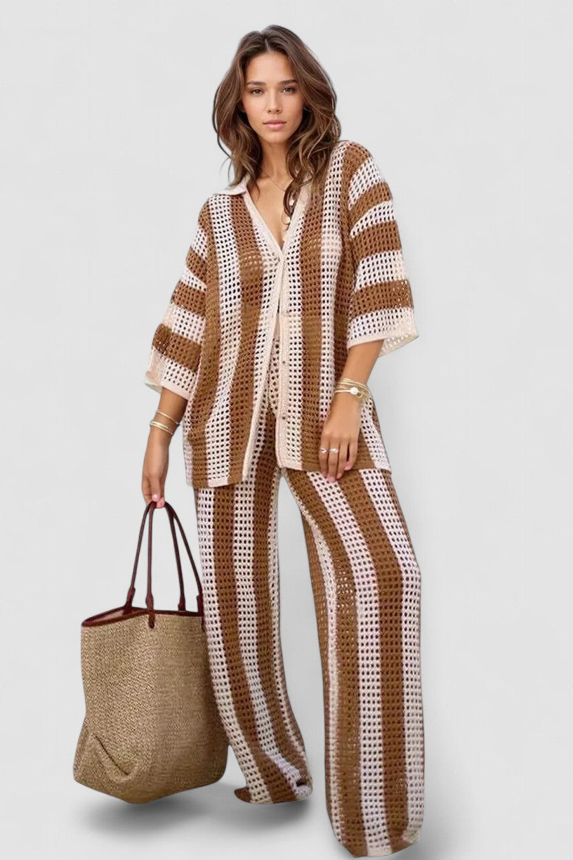 Pentru femeile care apreciază moda rafinată cu o notă contemporană, Setul Rayat Amelia Elara este combinația perfectă între luxul relaxat și sofisticarea fără efort. Acest ansamblu din două piese include o bluză fluidă cu decolteu în V și detalii delicate cu decupaje, asociată cu pantaloni cu picioare largi care se drapează frumos pentru o siluetă avantajoasă. Confecționat dintr-un material moale și respirabil, designul său cu dungi atemporale asigură versatilitate pentru orice ocazie—fie că te îmbraci pentru o plimbare elegantă prin oraș, o vacanță sau o ținută de zi cu zi elevată.