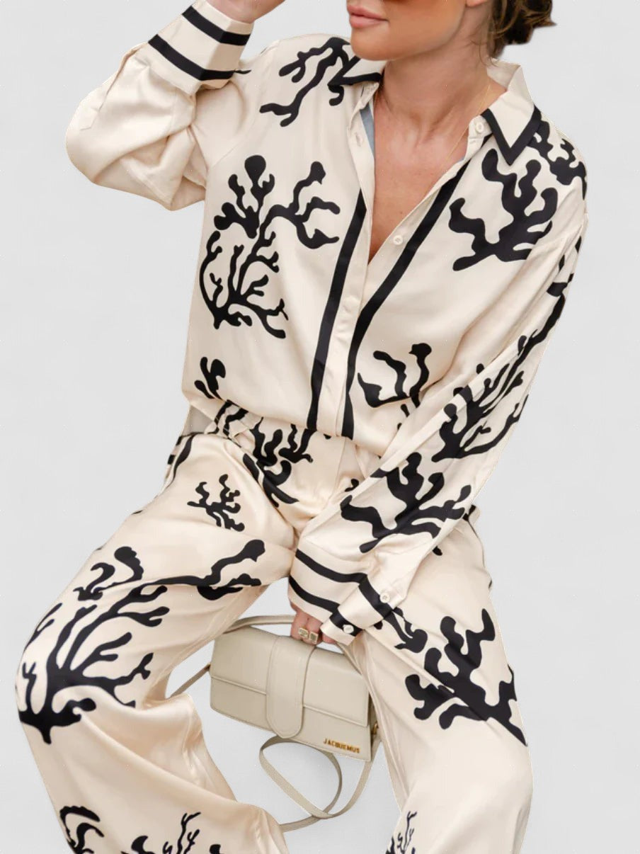Setul de pijamale Emma combină perfect luxul și confortul. Fabricat din viscoză netedă ca mătasea, cu un finisaj strălucitor, oferă o senzație incredibil de moale pe piele. Imprimarea modernă neagră pe un fundal crem adaugă o notă contemporană acestui ansamblu elegant. Croiala relaxată și materialul fluid asigură libertate maximă de mișcare—perfect pentru a te relaxa acasă sau pentru a face o declarație stilată într-un resort.