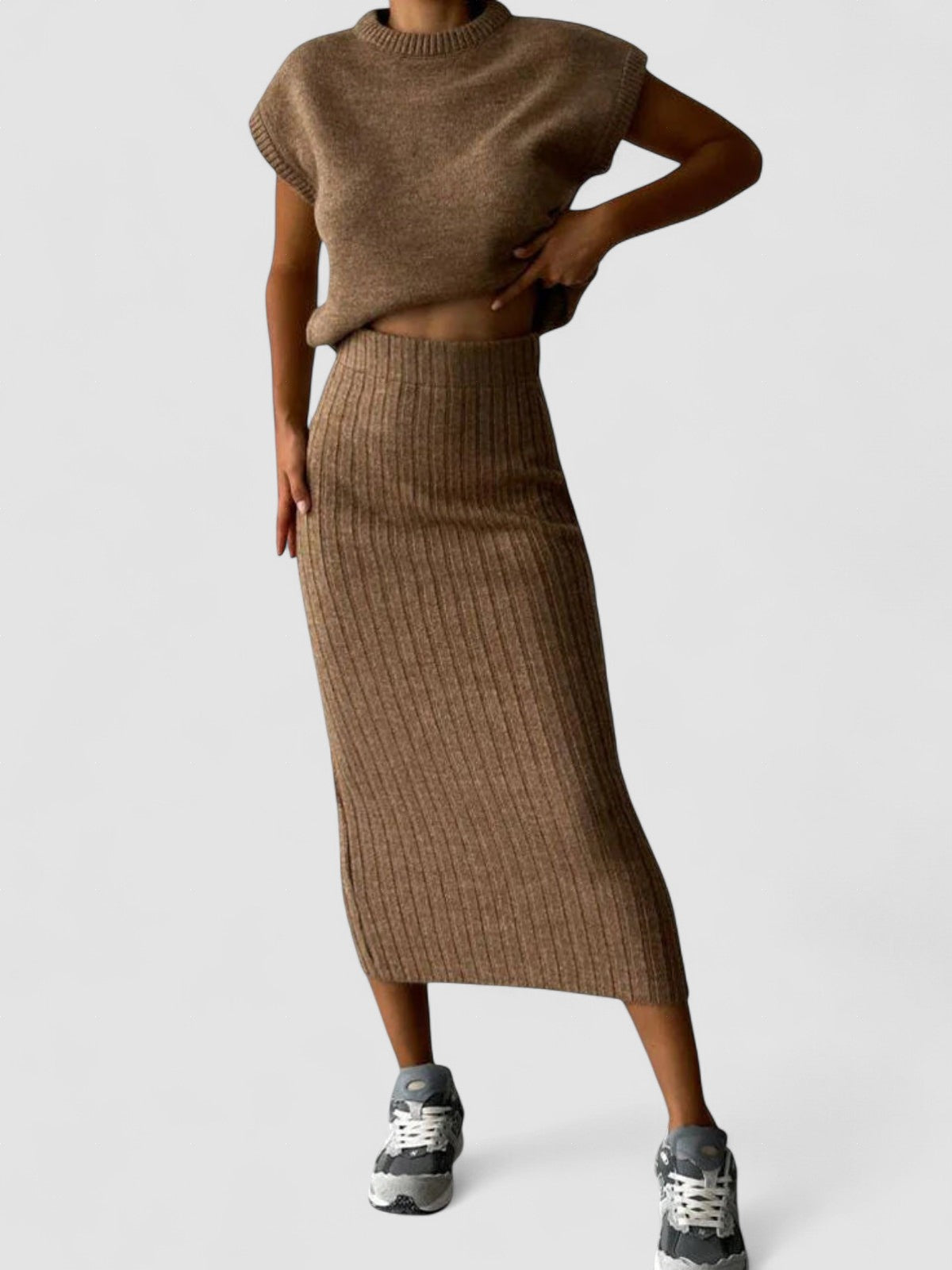 Set Asortat: Top Tricotat Gros și Fustă Midi Tricotată cu Talie Înaltă
