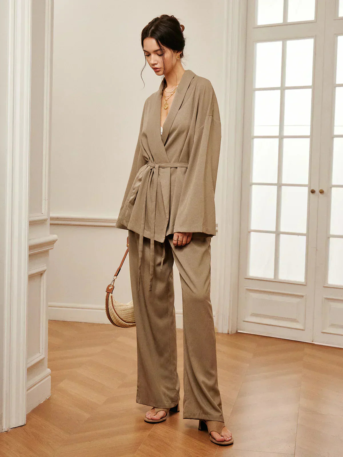 Design: Un set sofisticat din două piese, cu un top în stil șifonat și talie cu curea, asociat cu pantaloni eleganți cu talie înaltă. Designul minimalist, dar structurat, oferă un aspect rafinat și fără efort.