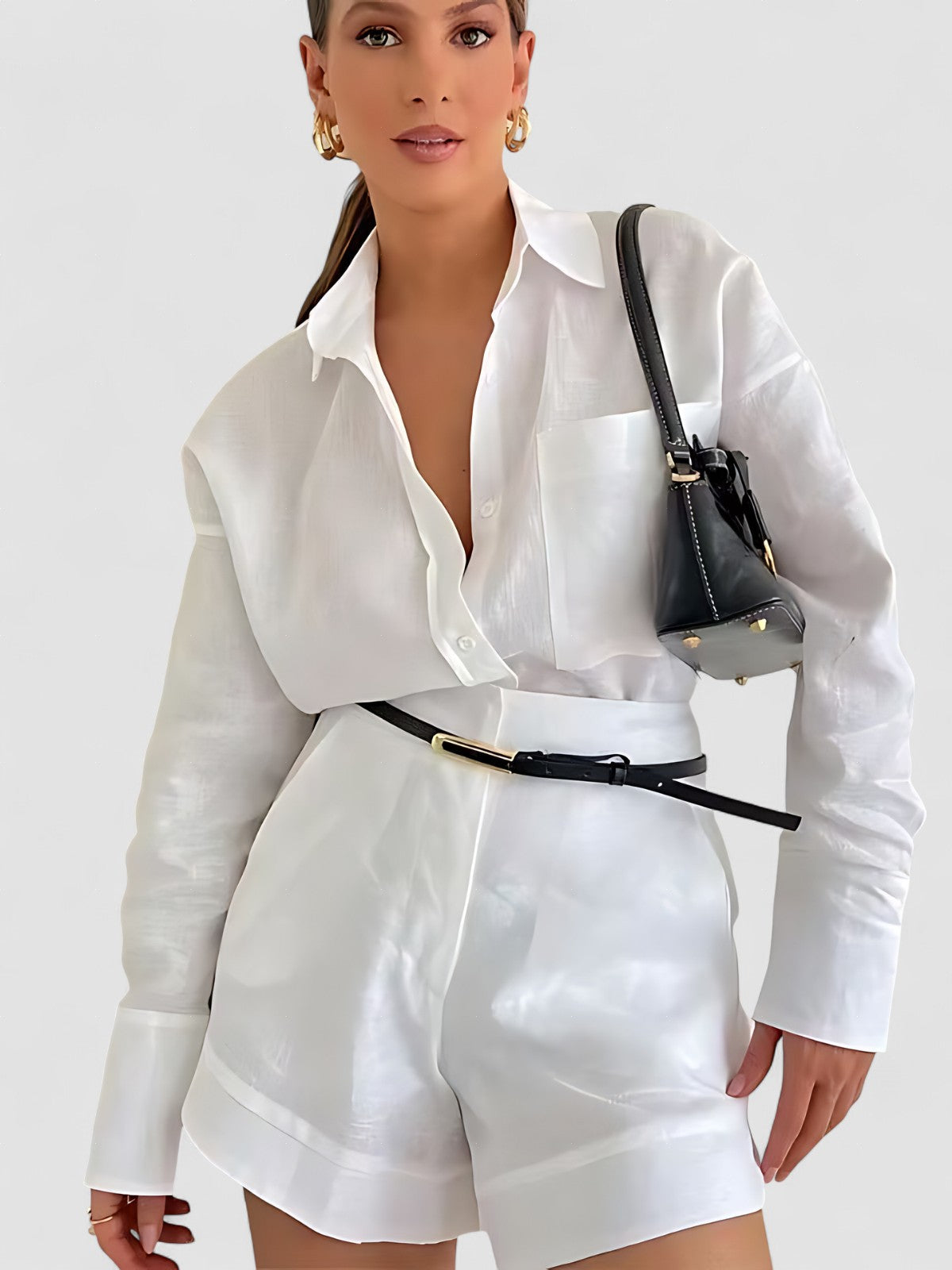 Design: Un set relaxat format din două piese, având o cămașă cu nasturi și un guler structurat, asociată cu șorturi asortate cu talie înaltă. Designul fără efort combină confortul cu o eleganță subtilă.